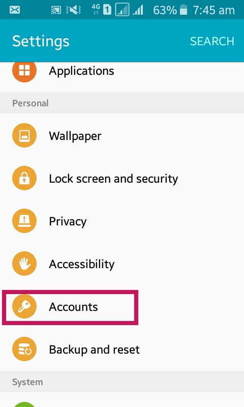 1st Step, Go to your mobile setting and click on accounts As Shown in The Picture